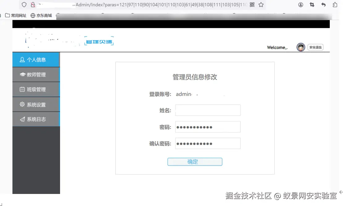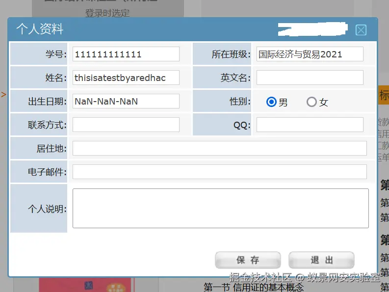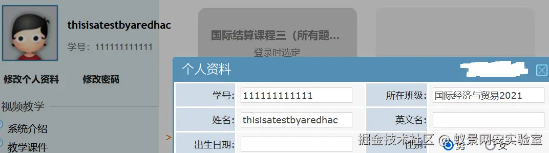 经过观察,除了修改个人资料与修改密码,其它均为查看资料的地方,尝试sql注入,RCE,文件包含,目录遍历等漏洞均无成果,于是将目光转到这两处功能点。