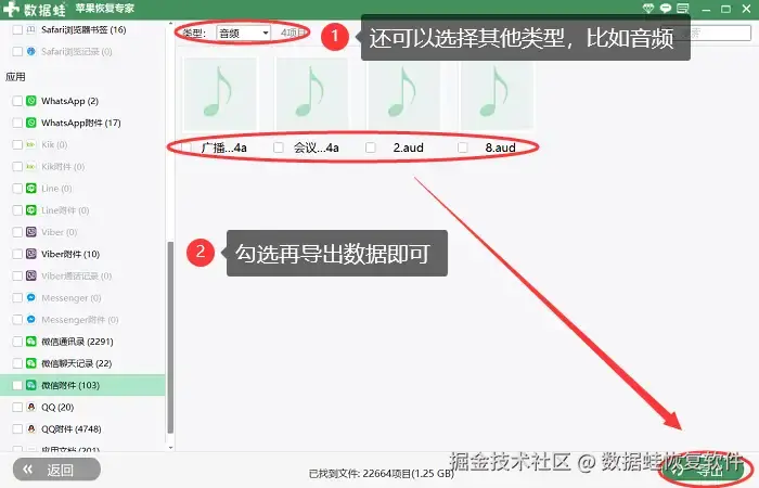 步骤2.在扫描完成后,软件将显示可恢复的微信数据列表。预览这些数据,并选择您想要恢复的【聊天记录、文档、音频、图片、视频】等。