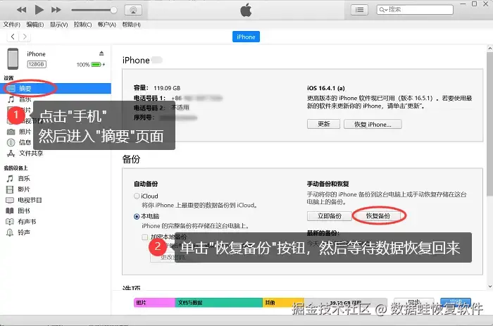 如果之前使用了iTunes备份了手机数据,可以通过这款工具进行恢复。但需要注意的是,iTunes恢复的数据不具备可选择性,即整机恢复。