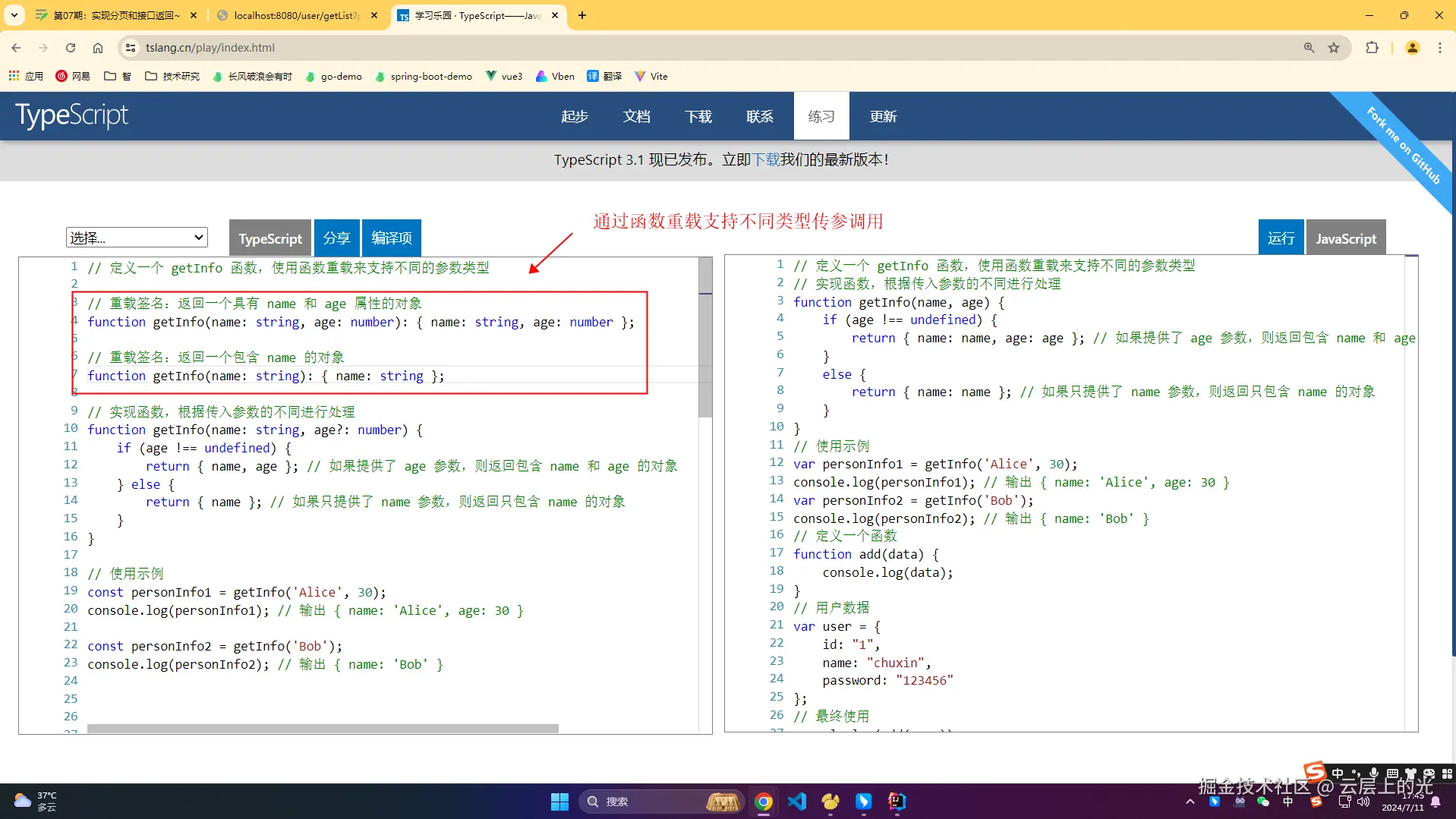 - getInfo('Alice', 30),这里传入了 name 和 age 参数,所以 TypeScript 会调用第一个重载,返回一个对象 { name: 'Alice', age: 30 }。