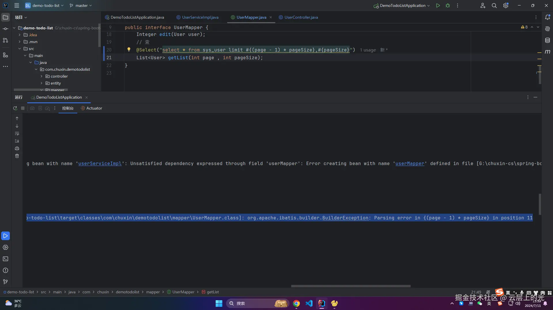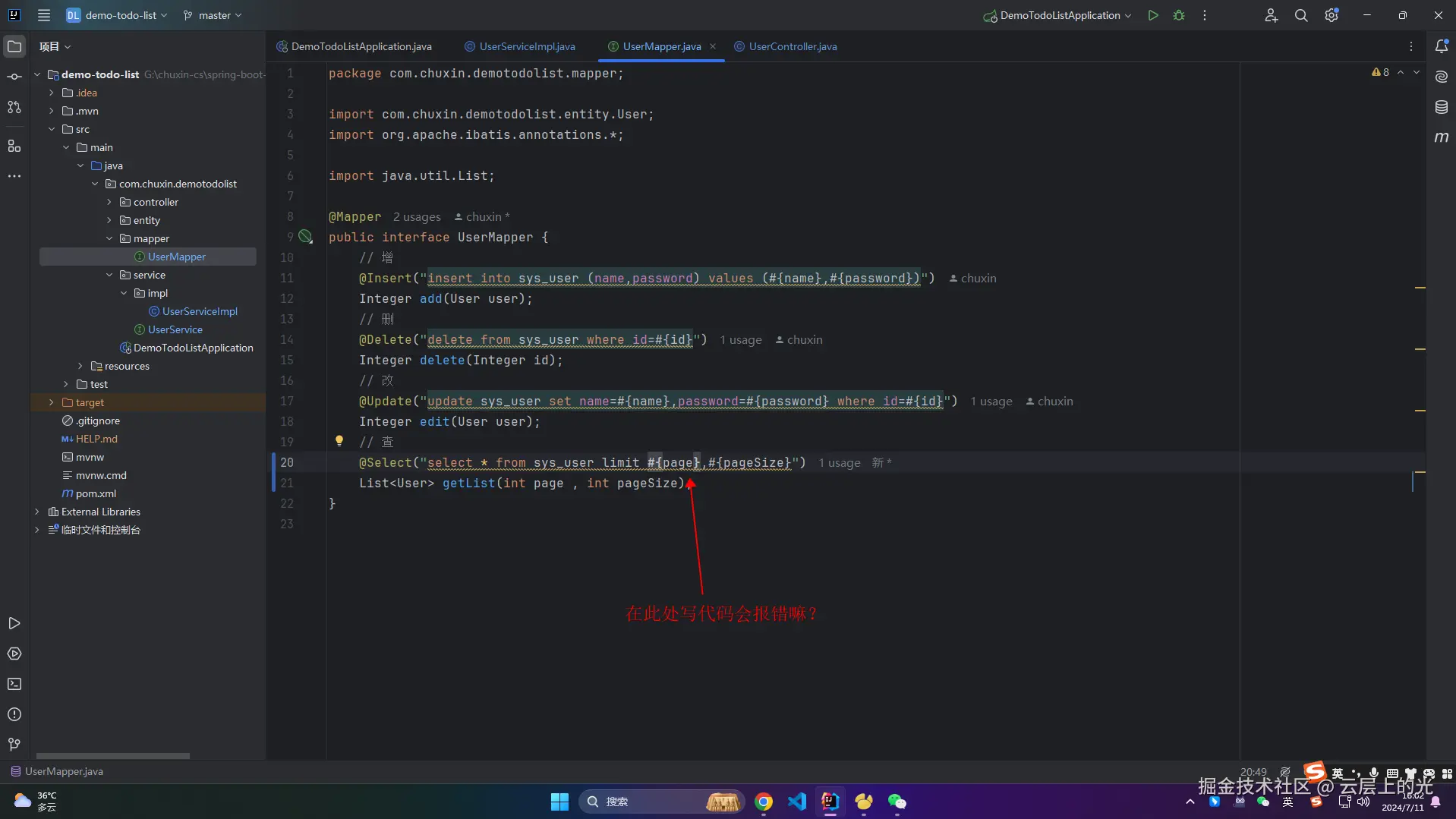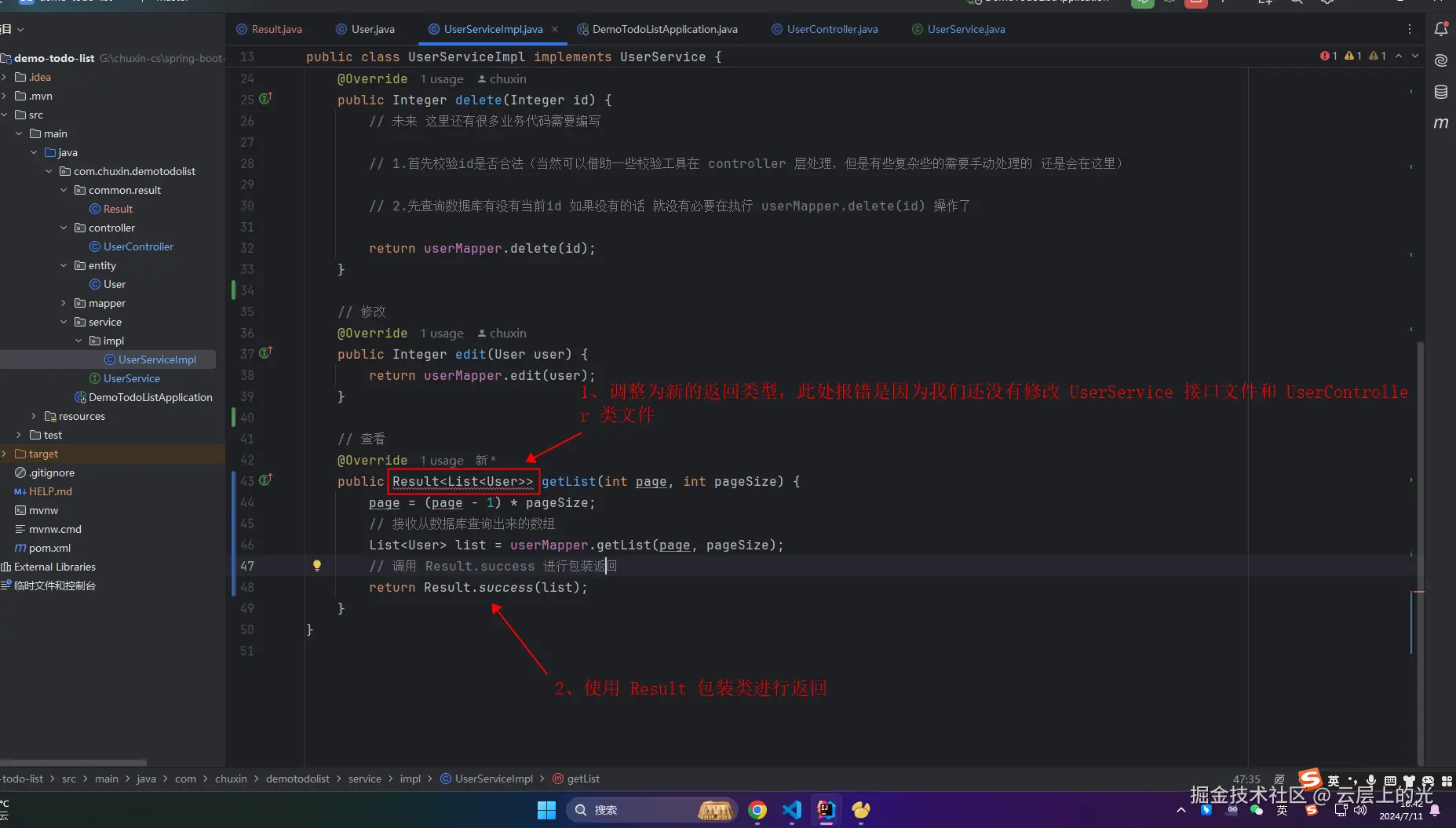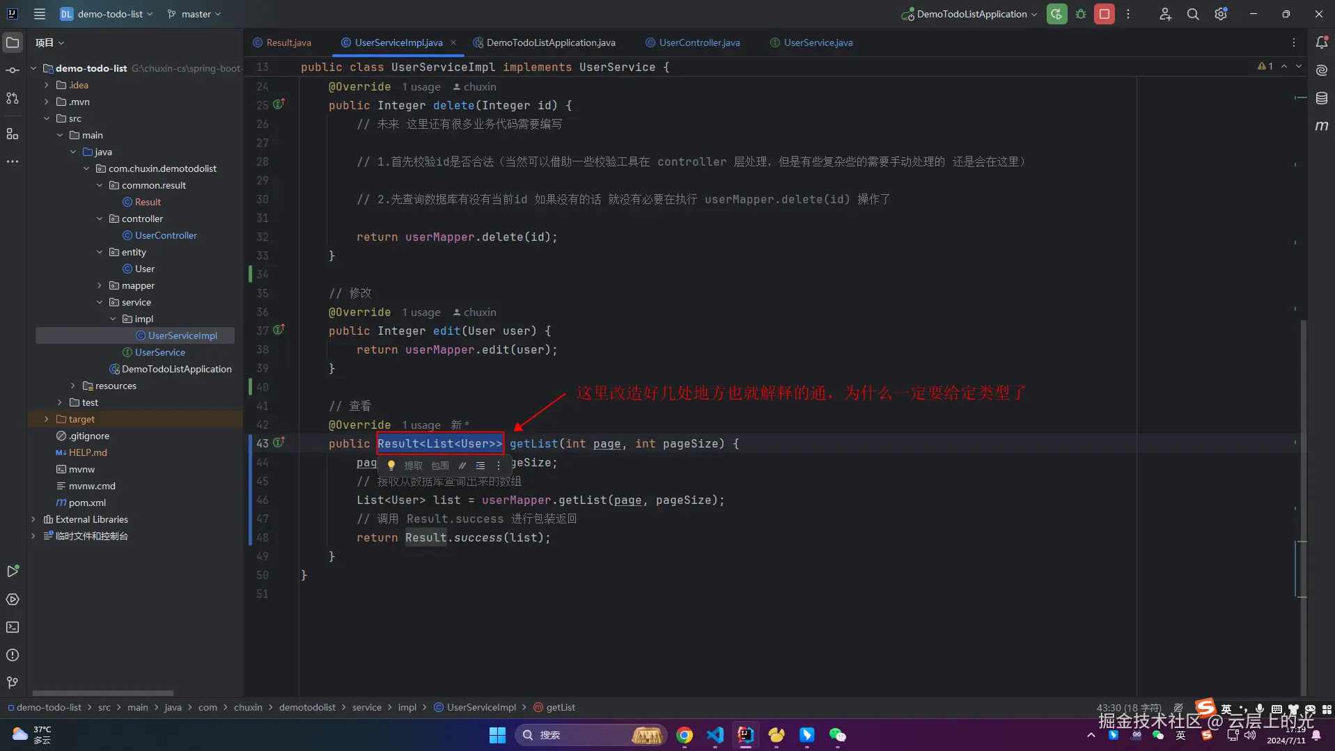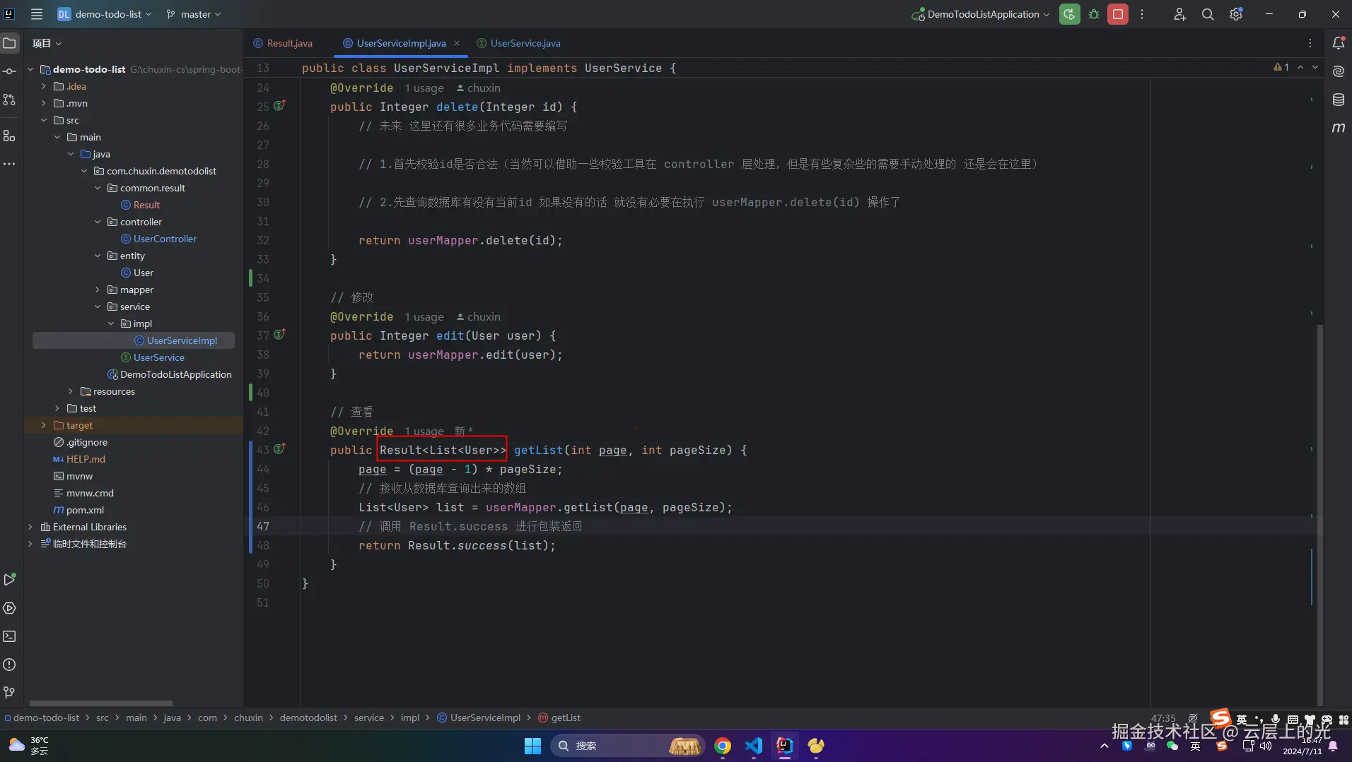 8、此时,service/impl 软件包下的 UserServiceImpl 类文件 中 getList 就不报错了