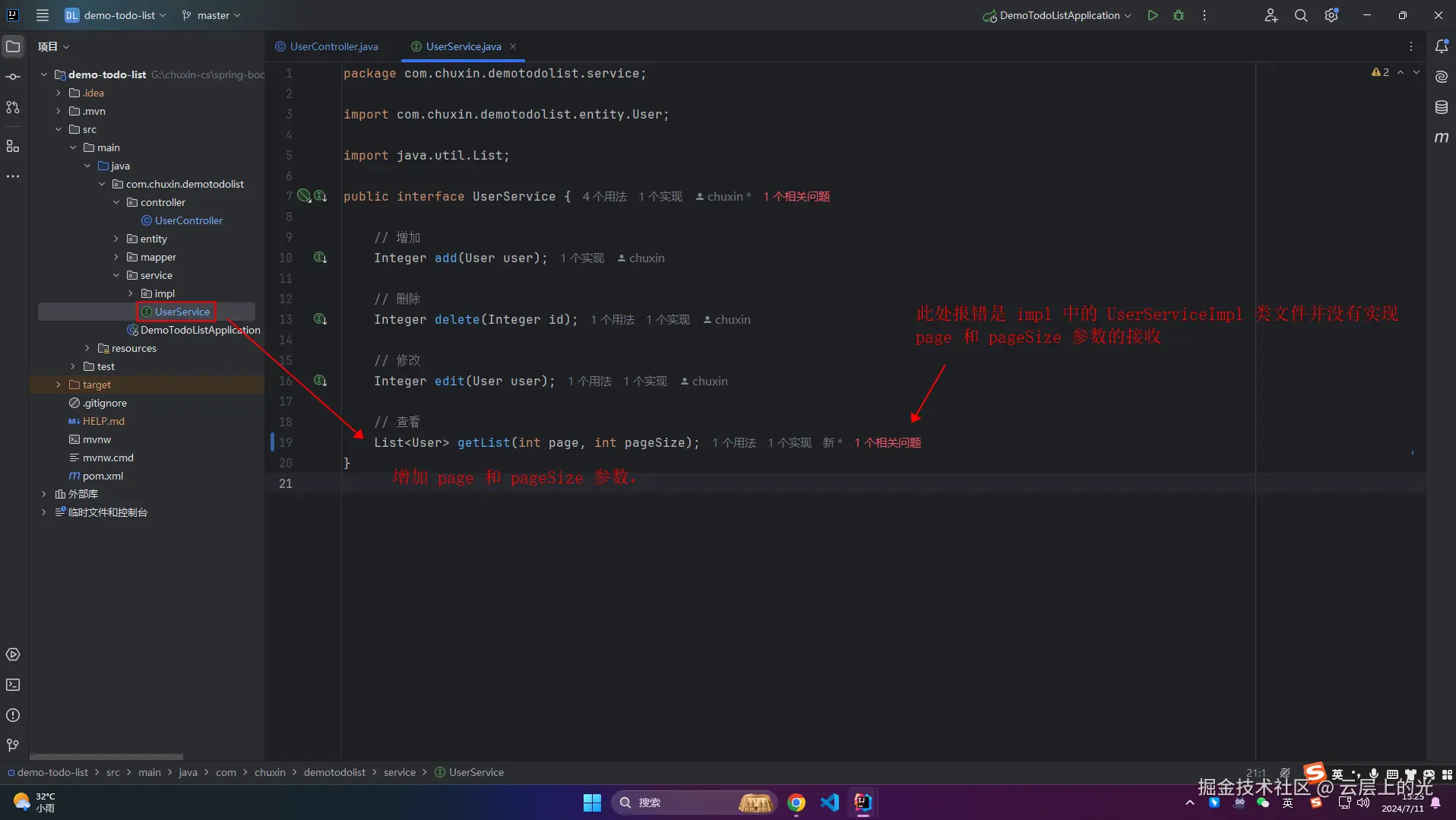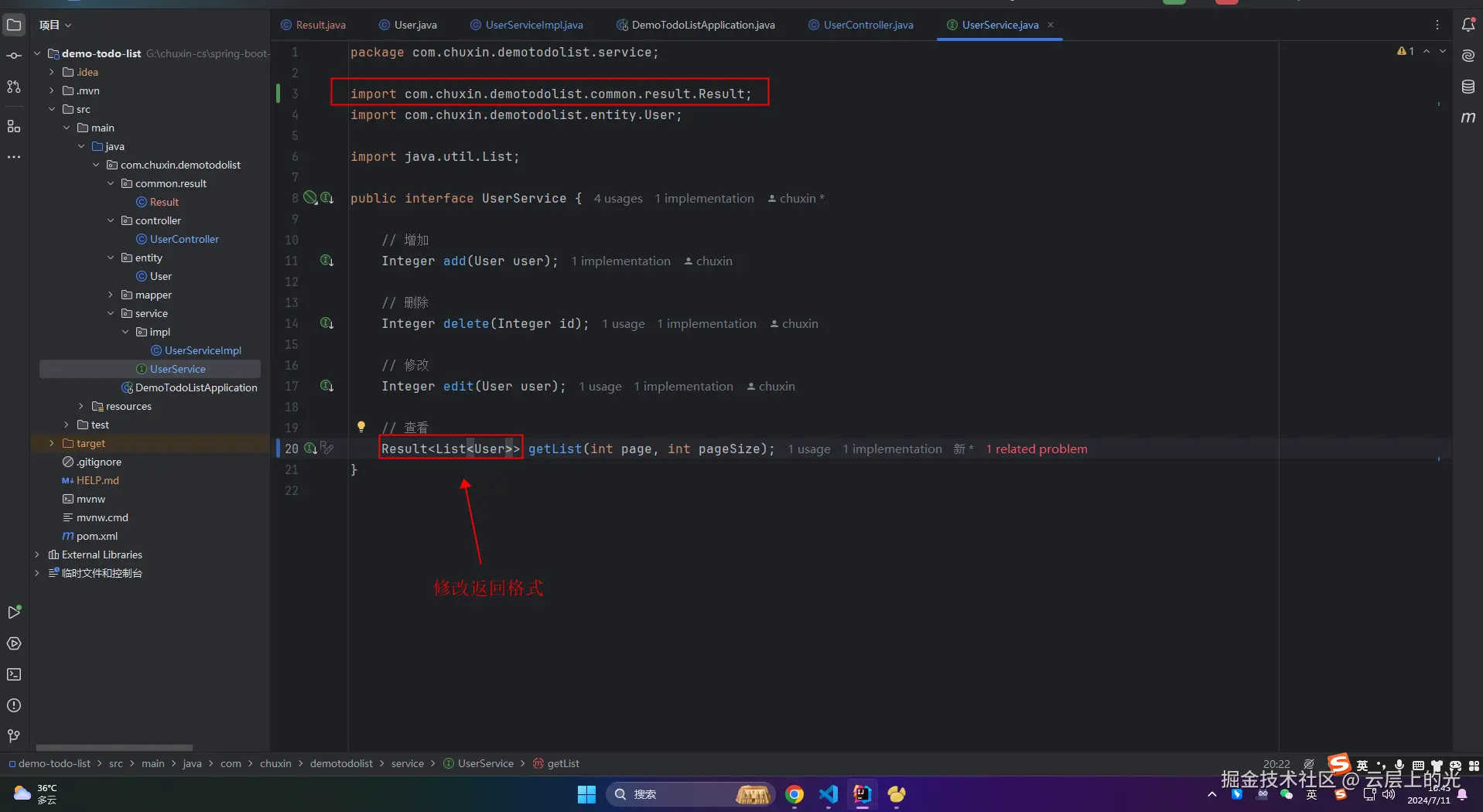 6、改造 service 软件包下的 UserService 接口文件
