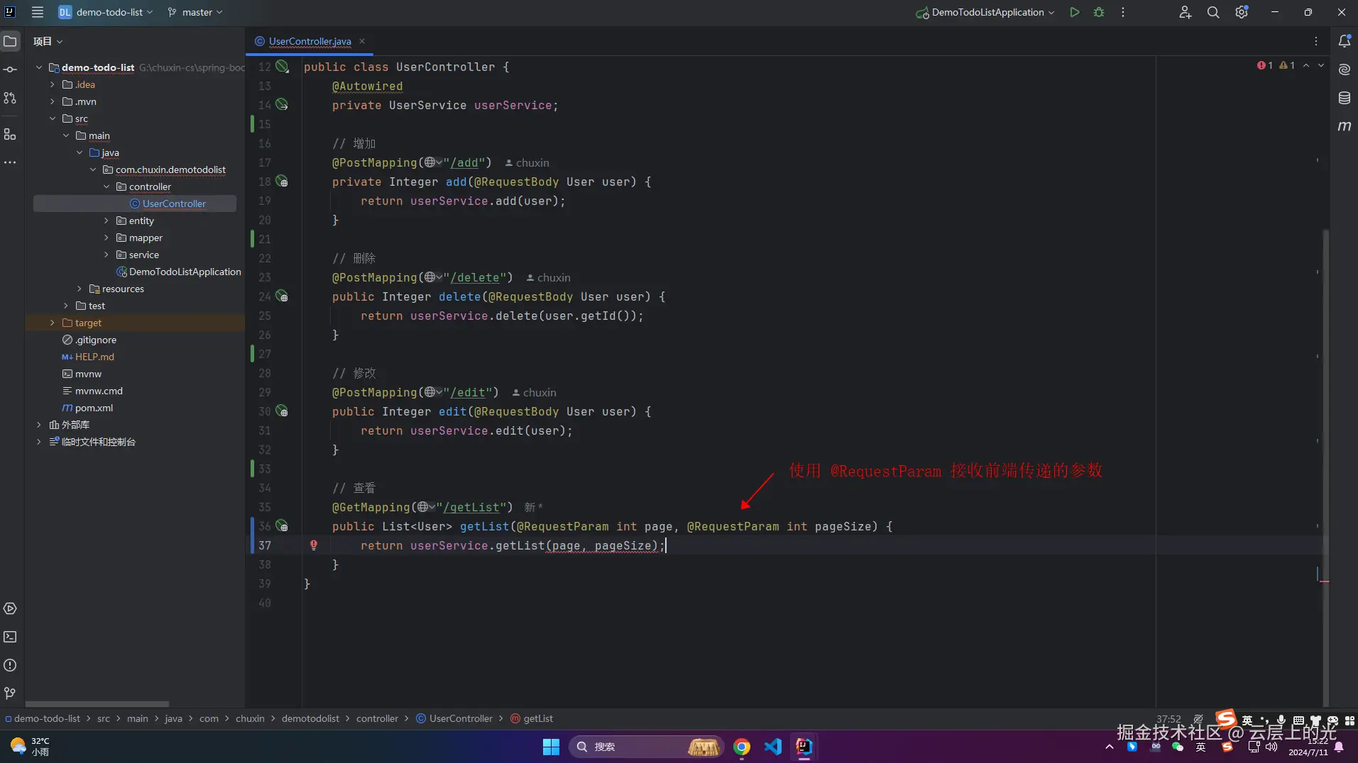 1、改造 controller 中 UserController 类文件,用于接收前端传参