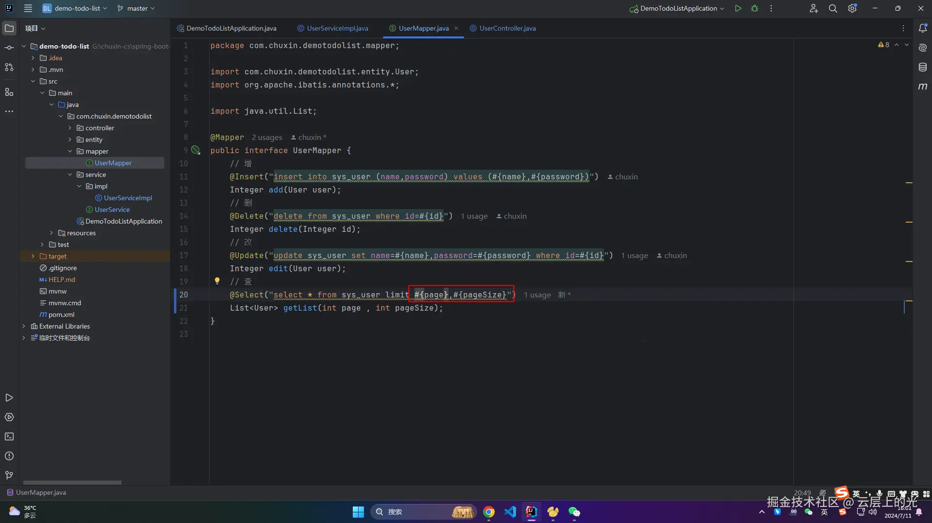 4、改造 mapper 软件包中的 UserMapper 接口文件