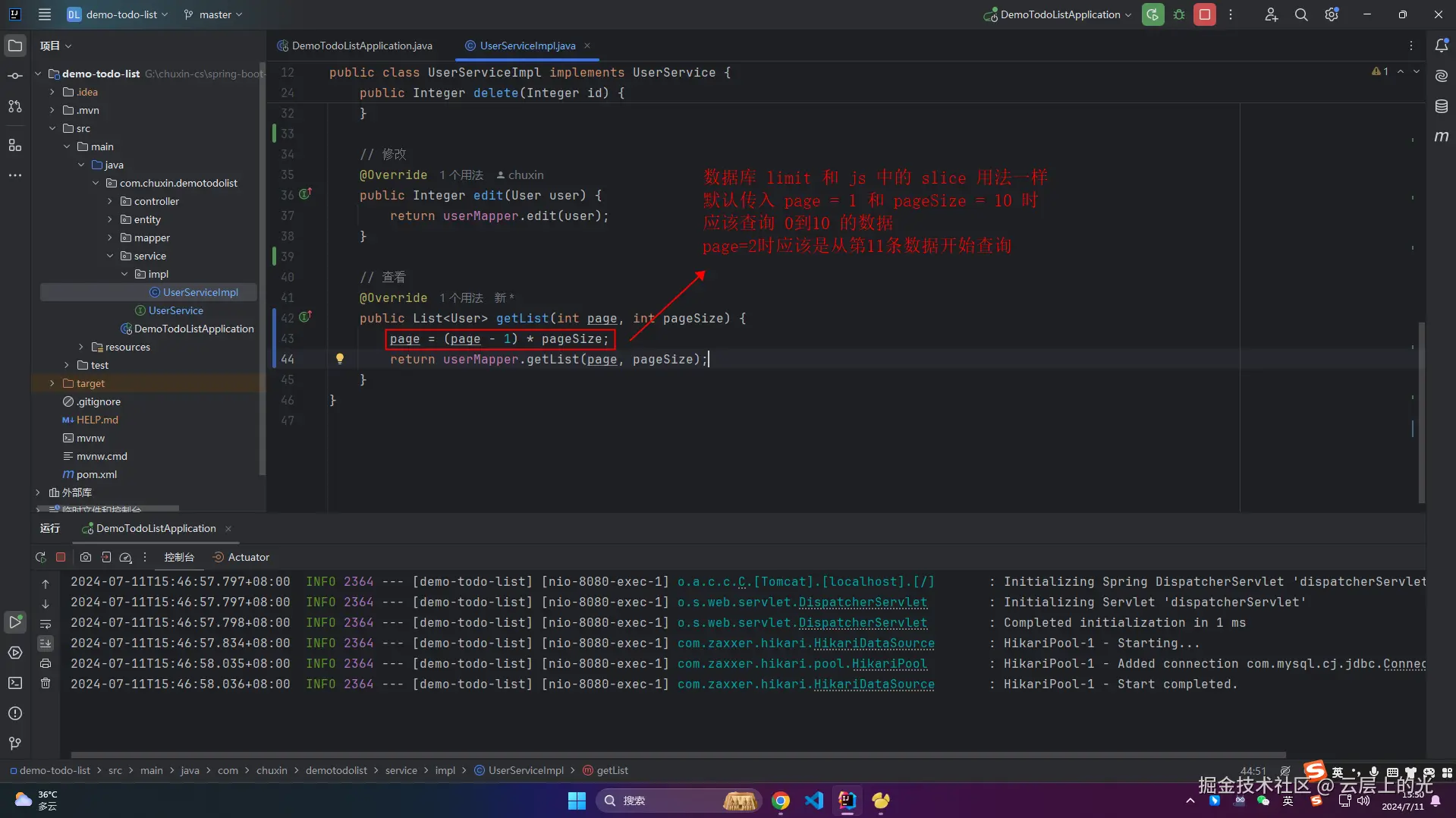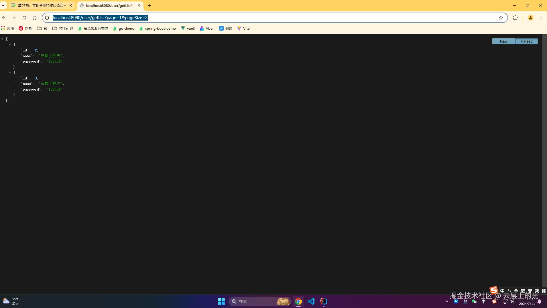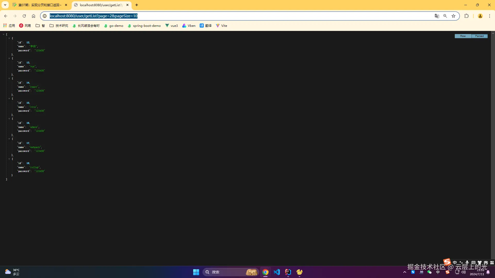 6、浏览器访问:http://localhost:8080/user/getList?page=1&pageSize=2