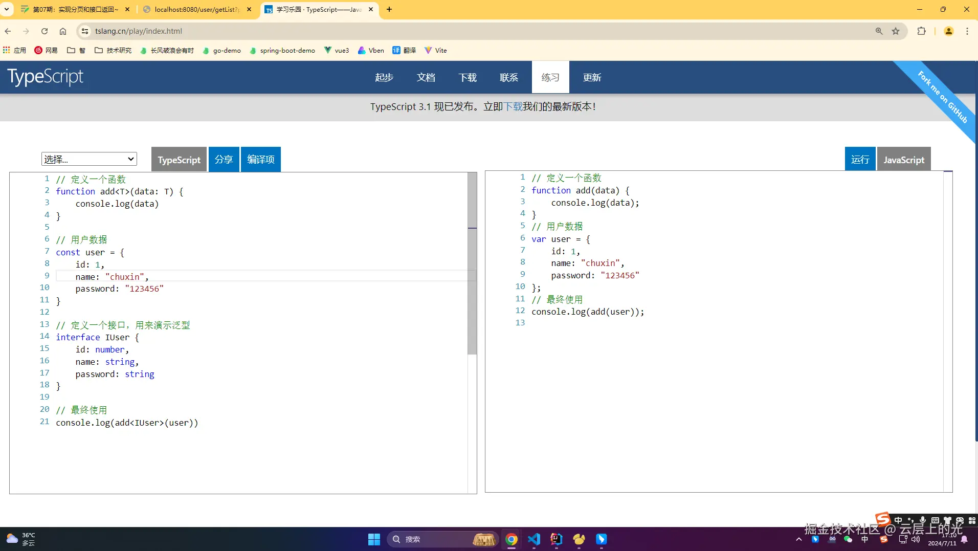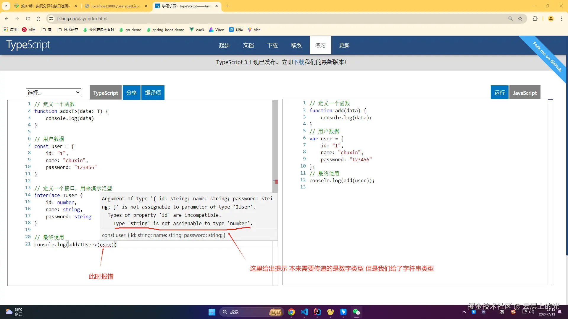 2、在前端的 typescript 中有相同用法,泛型主要代表暂时不确定的类型可以先用一个类型描述占位,等真实使用时会传递类型进来,这个时候再用这个类型进行校验: