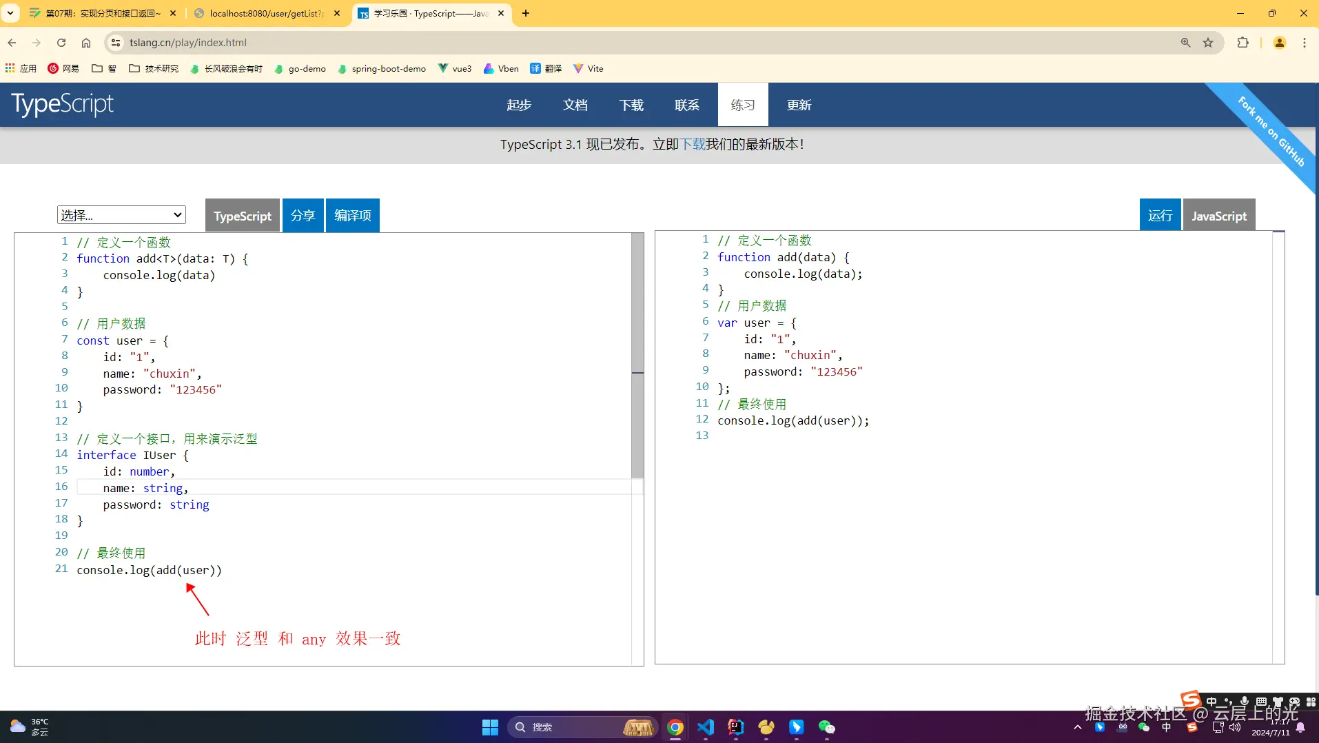 4、如果是这样的话,去掉 console.log(add(user)) 中的 IUser 那么泛型应该就和 any 效果一致