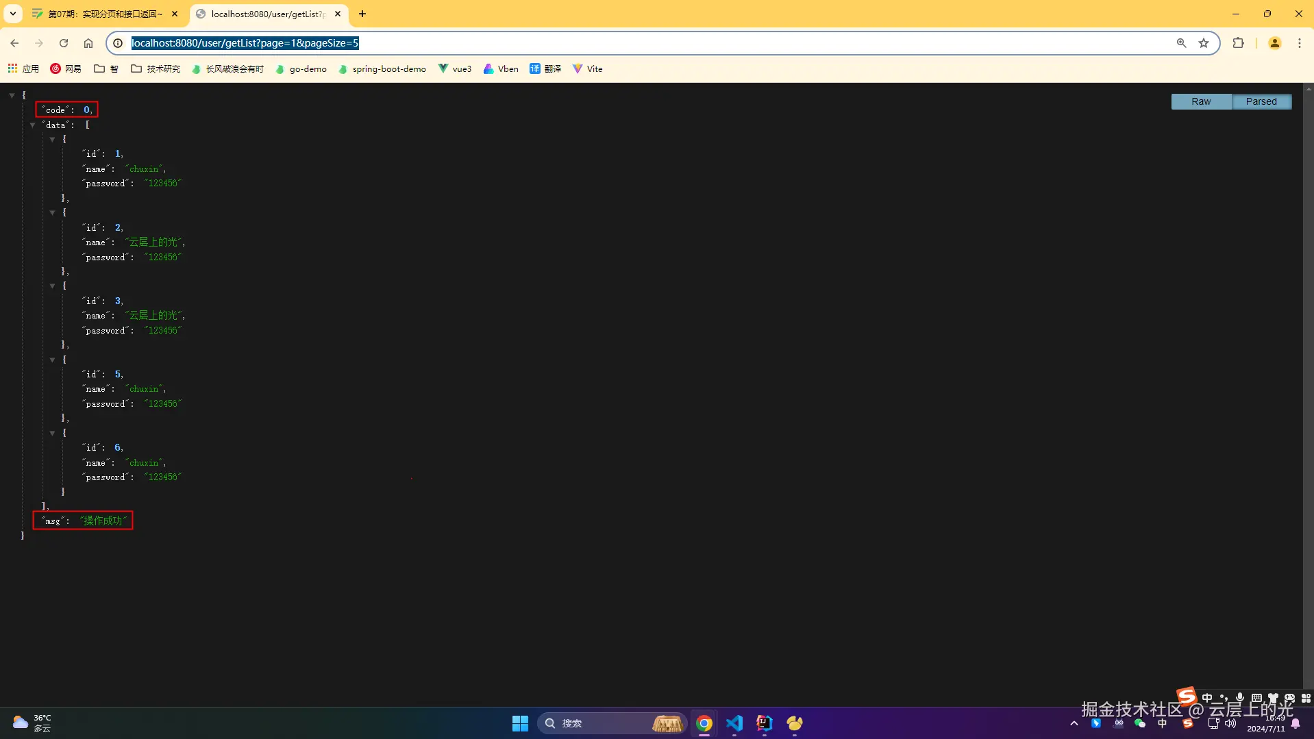 10、浏览器访问:http://localhost:8080/user/getList?page=1&pageSize=5