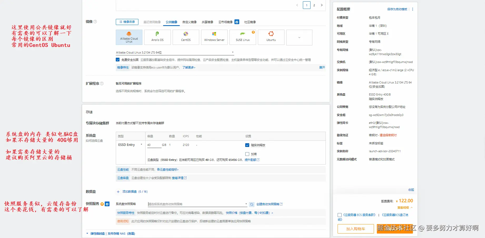 - 镜像:选择操作系统镜像。如果你不想自己配置,可以选择预装环境的镜像。