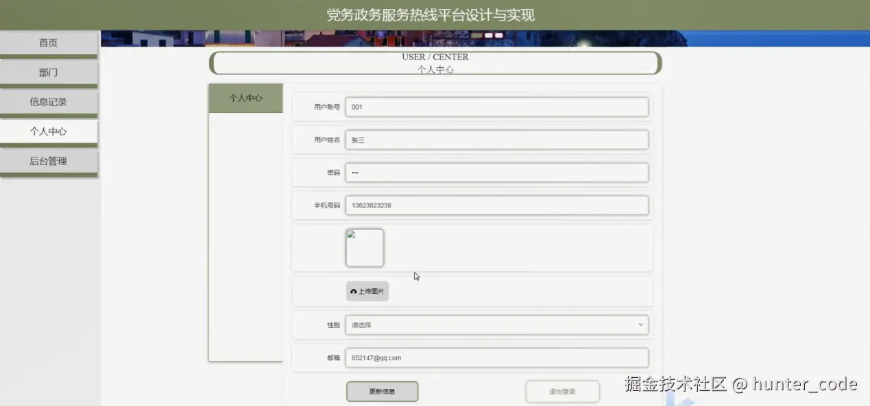 个人中心,在个人中心页面通过填写用户账号、用户姓名、密码、手机号码、上传图片、性别、邮箱等信息进行更新操作,如图5-5所示。