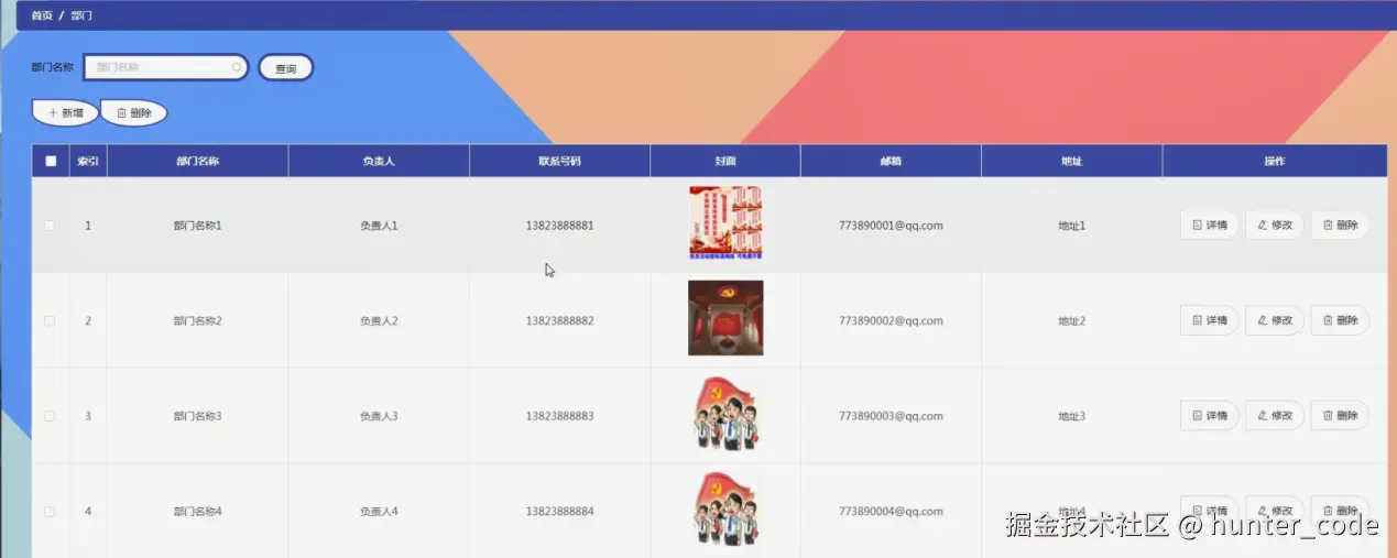 部门管理,在部门管理页面可以对索引、部门名称、负责人、联系号码、封面、邮箱、地址等内容进行详情,修改和删除等操作,如图5-10所示。