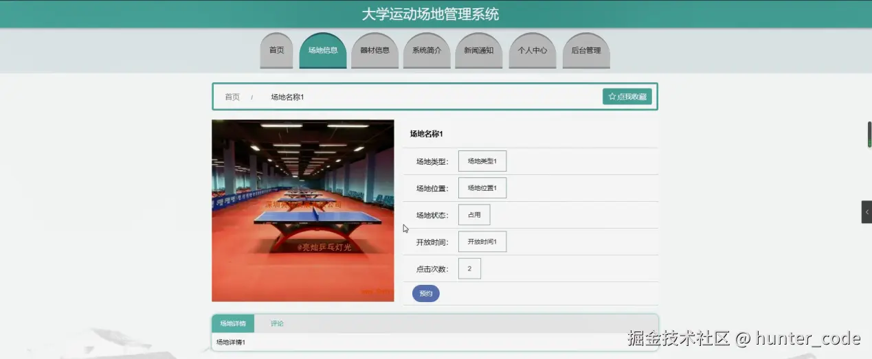 场地信息,在场地信息页面可以查看场地名称、场地类型、场地位置、图片、场地状态、开放时间、点击次数、场地详情等内容,并进行预约,评论和收藏等操作,如图5-3所示。