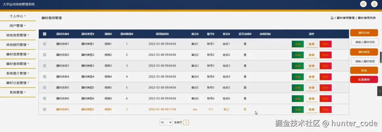 器材借用管理,在器材借用管理页面可以对器材名称、器材类型、规格、器材数量、借用时间、备注、账号、姓名、是否审核、审核回复等内容进行审核,查看或删除操作,如图5-13所示。