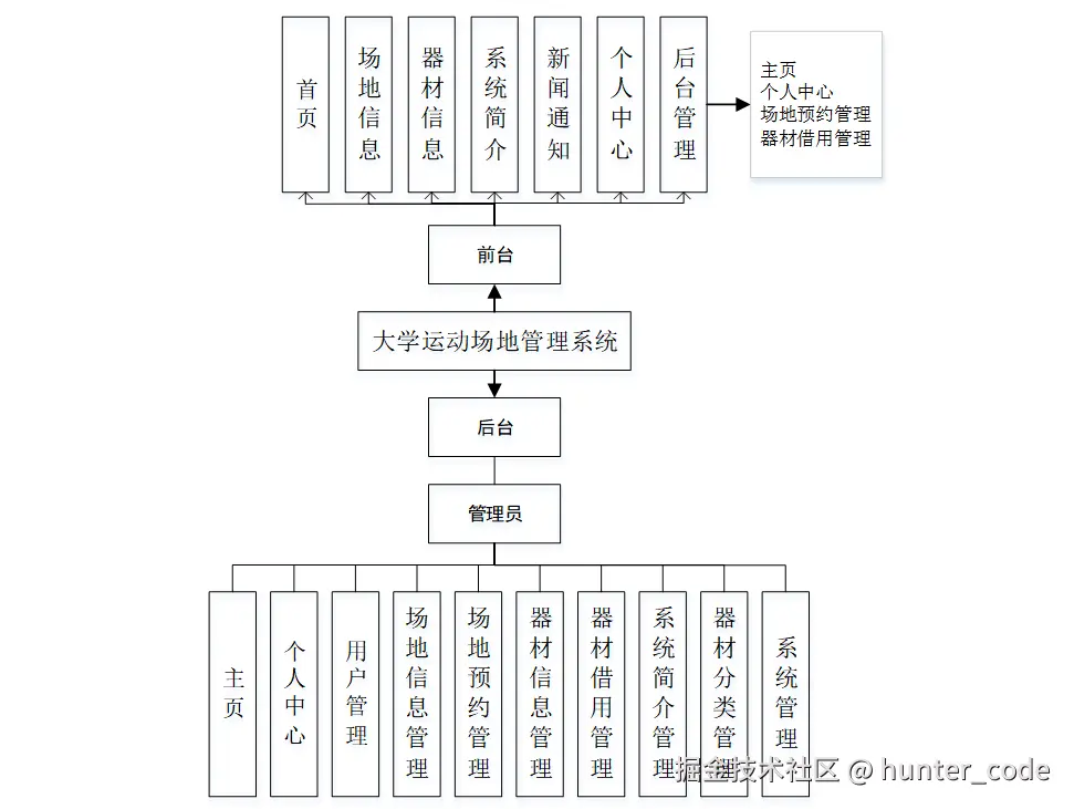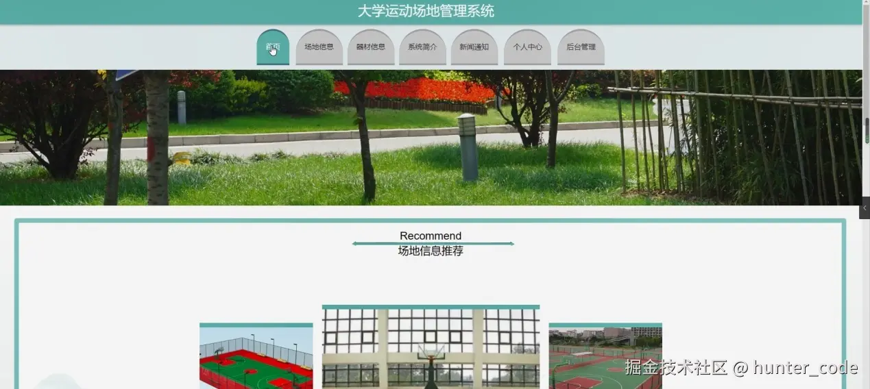 大学运动场地管理系统,在平台首页可以查看首页、场地信息、器材信息、系统简介、新闻通知、个人中心、后台管理等内容,并进行详细操作;如图5-1所示。