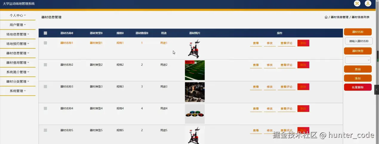 器材信息管理,在器材信息管理页面可以对器材名称、器材类型、规格、器材数量、用途、器材图片等内容进行查看,修改,查看评论和删除操作,如图5-12所示。