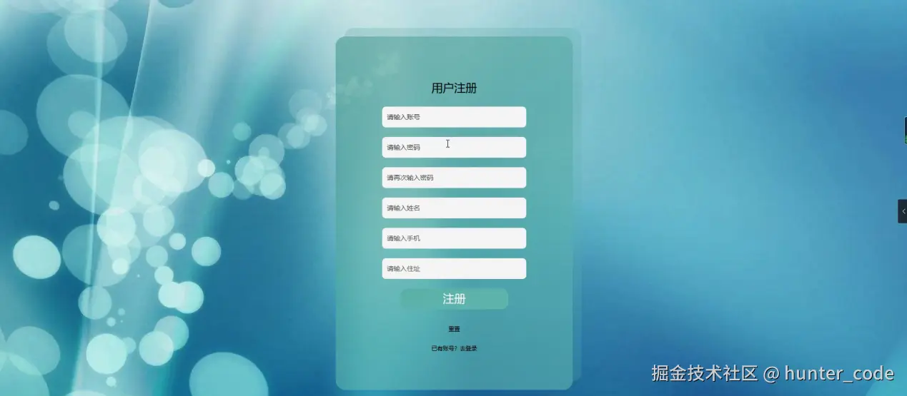 用户注册,在用户注册页面通过填写账号、密码、再次输入密码、姓名、手机、住址等信息进行注册操作,如图5-2所示。
