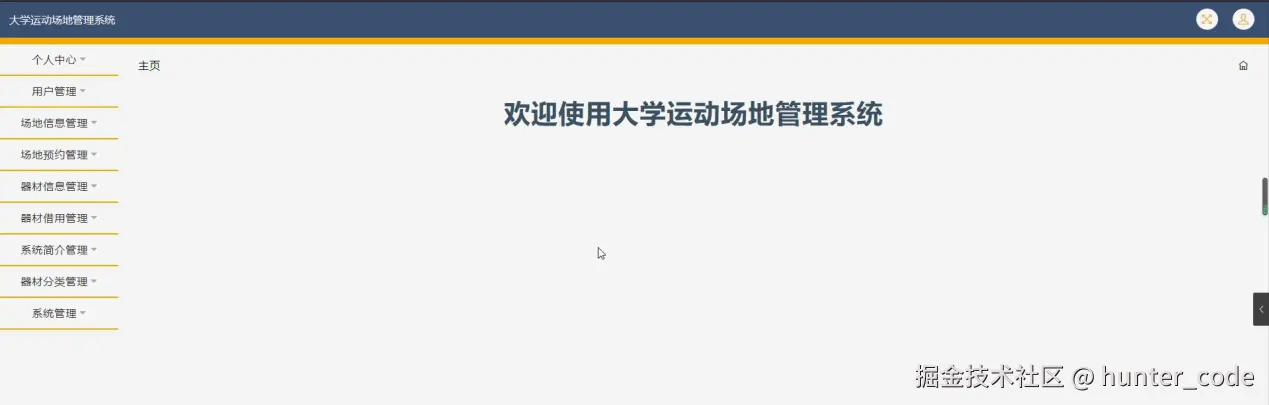 用户登录进入大学运动场地管理系统后台可以对主页、个人中心、场地预约管理、器材借用管理等功能进行相应操作,如图5-17所示。