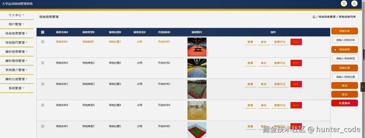 场地信息管理,在场地信息管理页面可以对场地名称、场地类型、场地位置、场地状态、开放时间、场地图片等信息进行查看,修改,查看评论和删除操作,如图5-10所示。