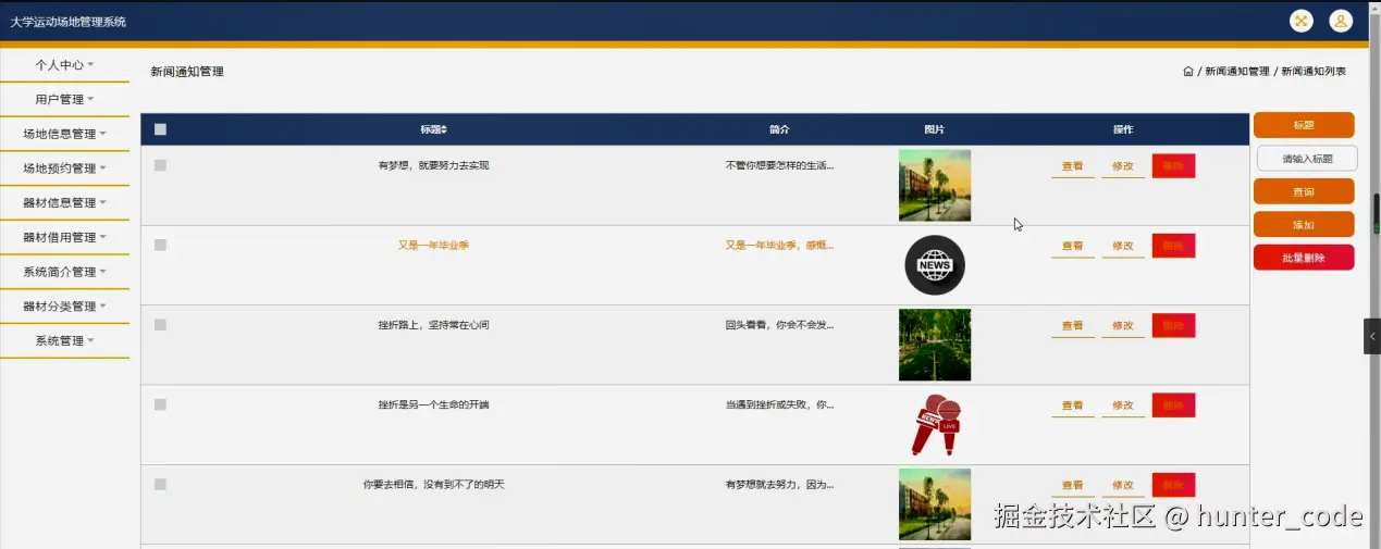 系统管理,在新闻通知管理页面可以对标题、简介、图片等内容进行查看,修改和删除等操作,还可以对轮播图管理进行详细的操作管理;如图5-16所示。