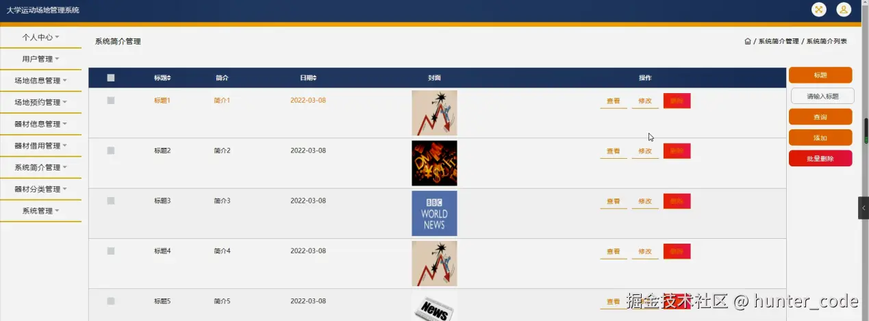 系统简介管理,在系统简介管理页面可以对标题、简介、日期、封面等内容进行查看,修改和删除操作,如图5-14所示。