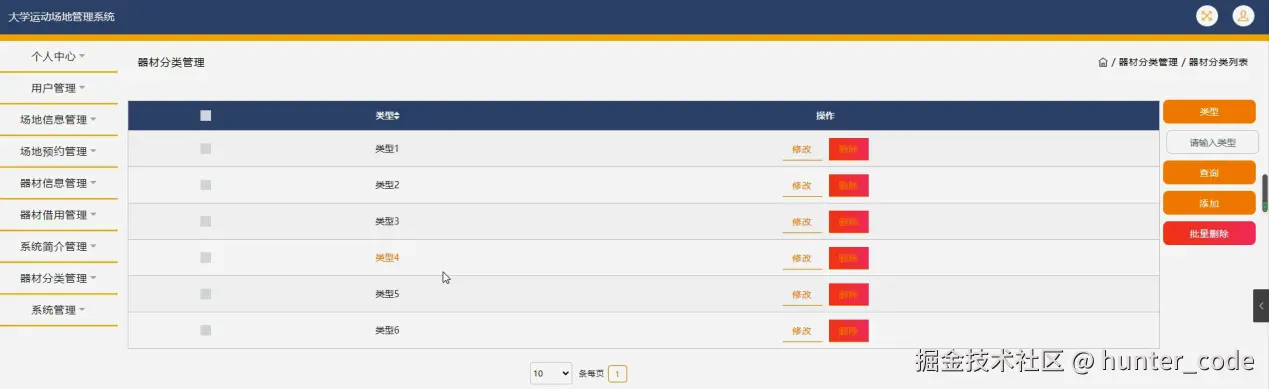 器材分类管理,在器材分类管理页面可以对类型信息进行修改和删除操作,如图5-15所示。