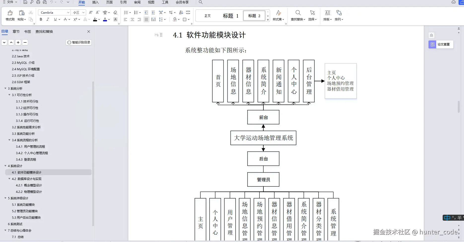 首先,论文一开始便是清楚的论述了系统的研究内容。其次,剖析系统需求分析,弄明白“做什么”,分析包括业务分析和业务流程的分析以及用例分析,更进一步明确系统的需求。然后在明白了系统的需求基础上需要进一步地设计系统,主要包罗软件架构模式、整体功能模块、数据库设计。本项目软件架构选择B/S模式,总体功能模块运用自顶向下的分层思想。再然后就是实现系统并进行代码编写实现功能。论文的最后章节总结一下自己完成本论文和开发本项目的心得和总结。通过大学运动场地管理系统将会使大学运动场地各个方面的工作效率带来实质性的提升。