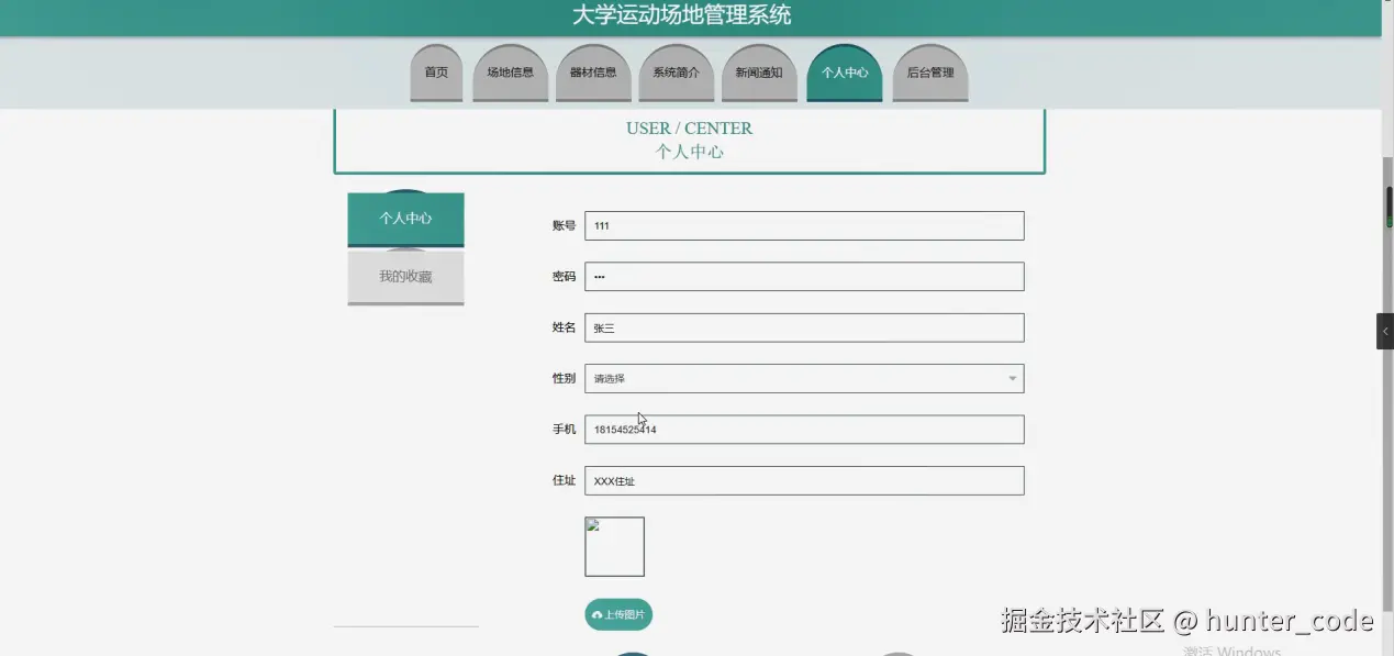 个人中心,在个人中心页面通过填写账号、密码、姓名、性别、手机、住址、上传图片等内容进行更新信息,还可以根据需要对我的收藏进行相对应操作,如图5-6所示。