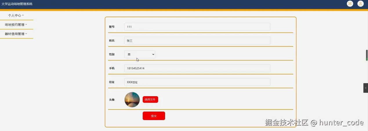 个人中心,在个人中心页面通过填写账号、姓名、性别、手机、住址、头像等内容并提交进行个人信息修改操作,如图5-18所示。