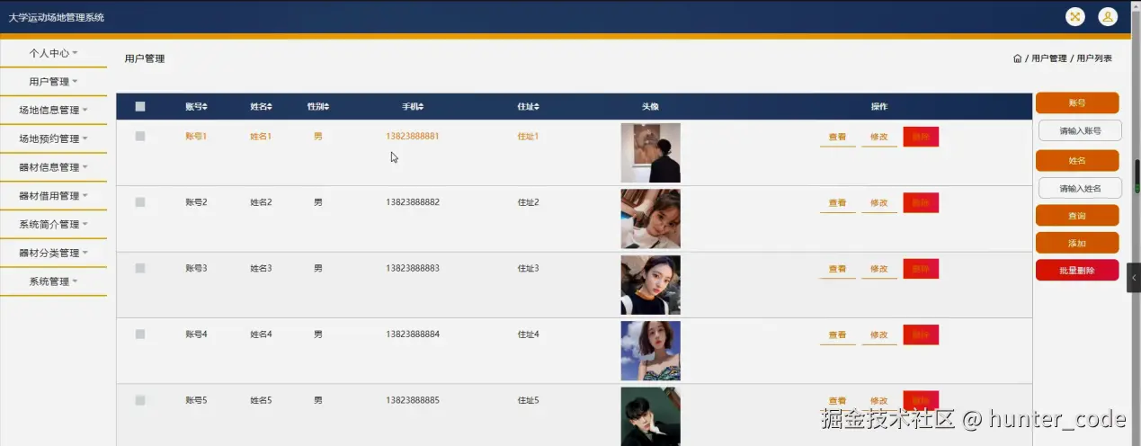 用户管理,在用户管理页面可以对账号、名、性别、手机、住址、头像等内容进行查看,修改和删除等操作,如图5-9所示。