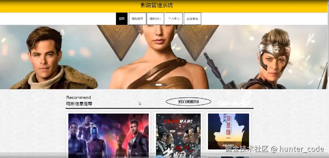 影院管理系统,系统首页可以查看首页,电影信息,电影资讯,个人中心,后台管理等内容并进行详细操作,如图5-1所示。