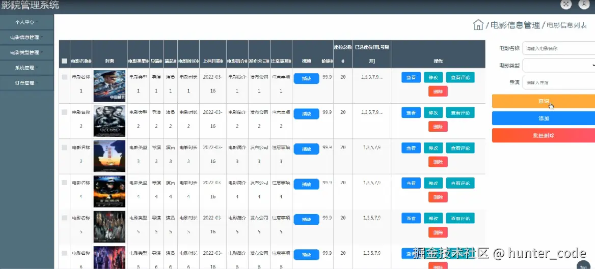 电影信息管理,在电影信息管理页面可以对电影名称,封面,电影类型,导演,演员,电影时长,上档日期,电影简介,发布公司,注意事项,价格,座位总数,已选座位等内容进行查看,修改,查看评论和删除等操作,如图5-7所示。