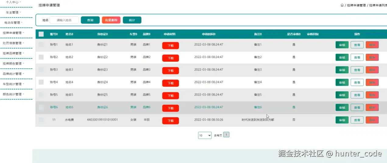 挂牌申请管理,在挂牌申请管理页面可以对账号、姓名、身份证、车型、品牌、申请材料、申请时间、备注、是否审核、审核回复等内容进行审核、查看或删除等操作,如图5-5所示。