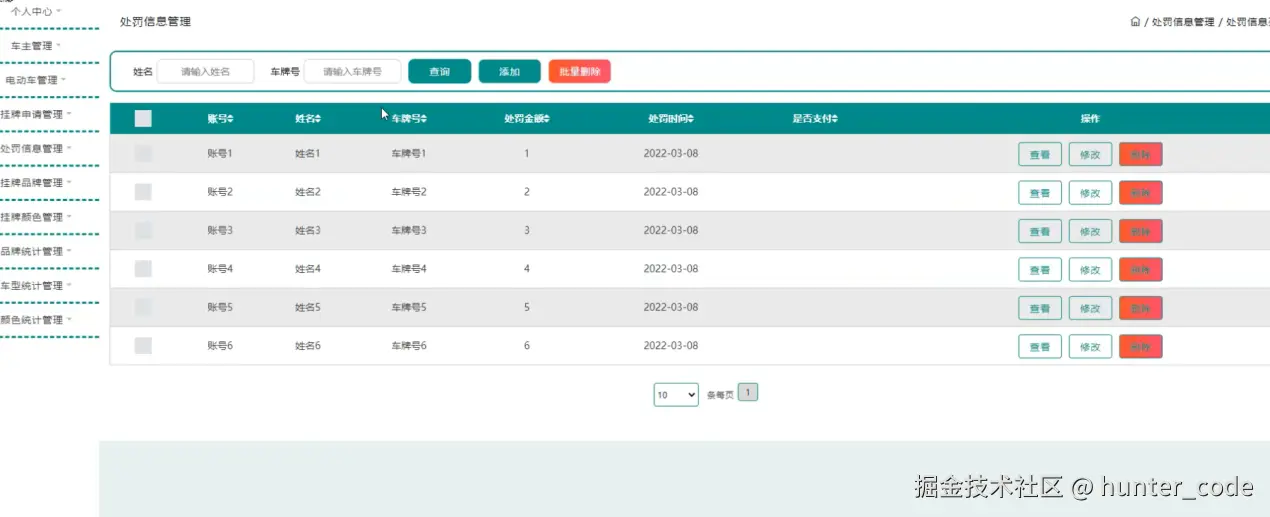 处罚信息管理,在处罚信息管理页面可以对账号、姓名、车牌号、处罚金额、处罚时间、是否支付等内容进行查看、修改或删除等操作,如图5-6所示。