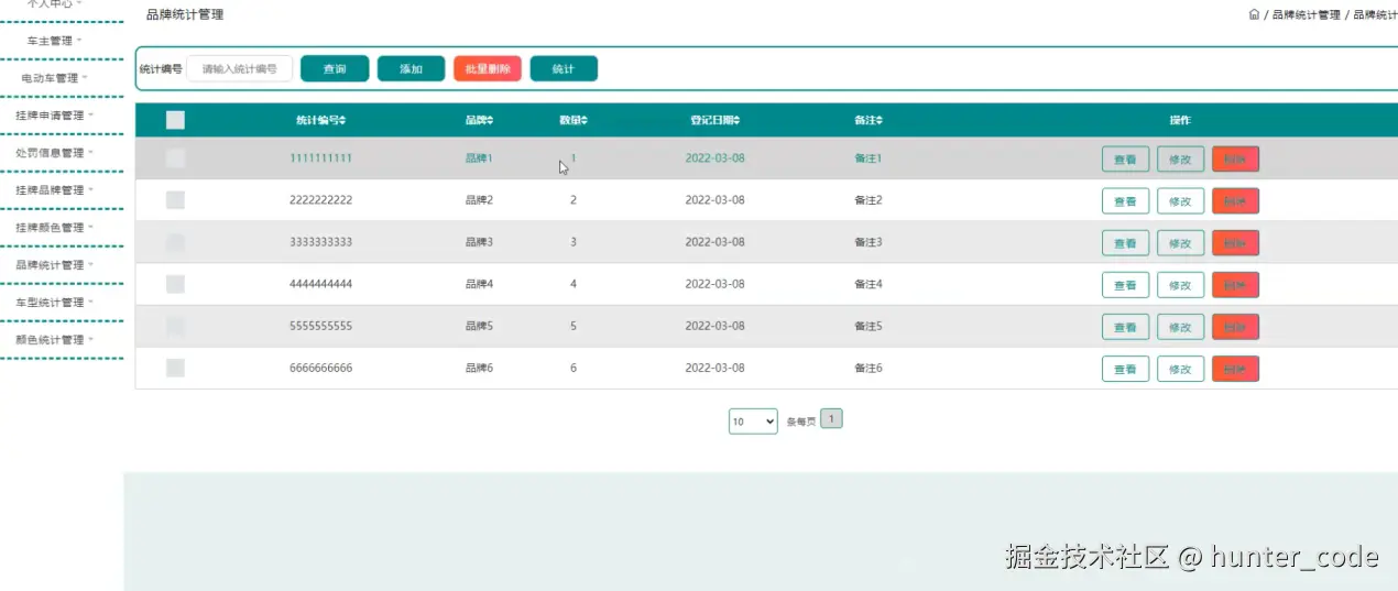 车型统计管理,在车型统计管理页面可以对统计编号、车型、数量、登记日期、备注等内容进行查看、修改或删除等操作,如图5-10所示。