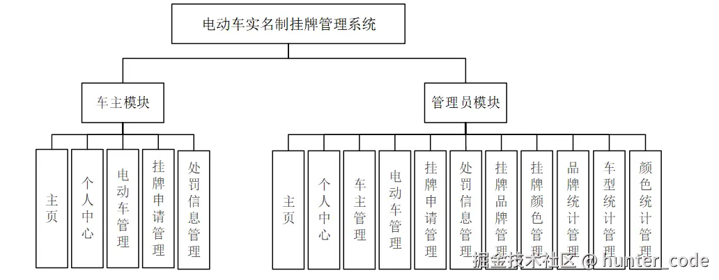 为了更好的去理清本系统整体思路,对该系统以结构图的形式表达出来,设计实现该电动车实名制挂牌管理系统的功能结构图如下所示: