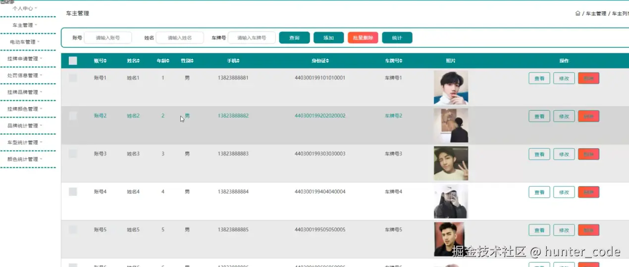 车主管理,在车主管理页面可以对账号、姓名、年龄、性别、手机、身份证、车牌号、照片等内容进行查看、修改或删除等操作,如图5-3所示。