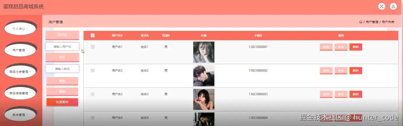 用户管理;在用户管理页面中可以对用户名、姓名、性别、头像、手机等内容进行查看,修改和删除等操作;如图4-8所示。