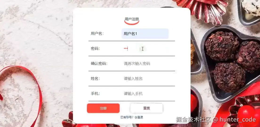 用户注册;在用户注册页面中输入用户名、密码、确认密码、姓名、手机等内容进行用户注册操作;如图4-3所示。