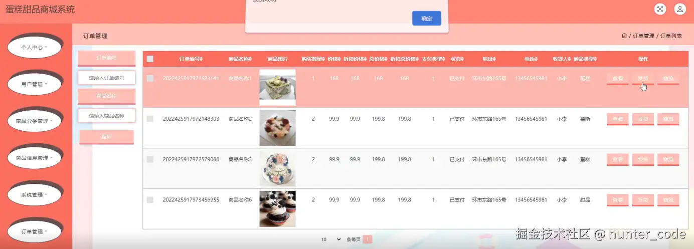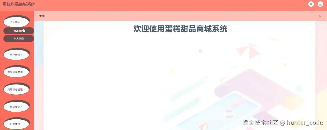 管理员登录进入蛋糕甜品商城系统可以查看个人中心、用户管理、商品分类管理、商品信息管理、系统管理、订单管理等信息进行详细操作,如图4-7所示。