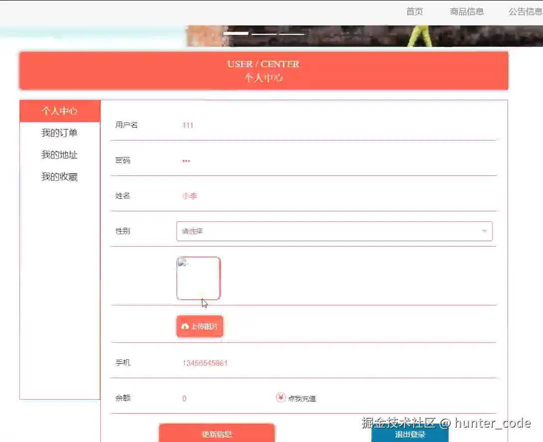 在个人中心页面中输入用户名、密码、姓名、性别、上传图片、手机、身余额等内容进行更新信息,并可以根据需要对我的订单,我的地址,的收藏进行详细的操作,如图4-4所示。