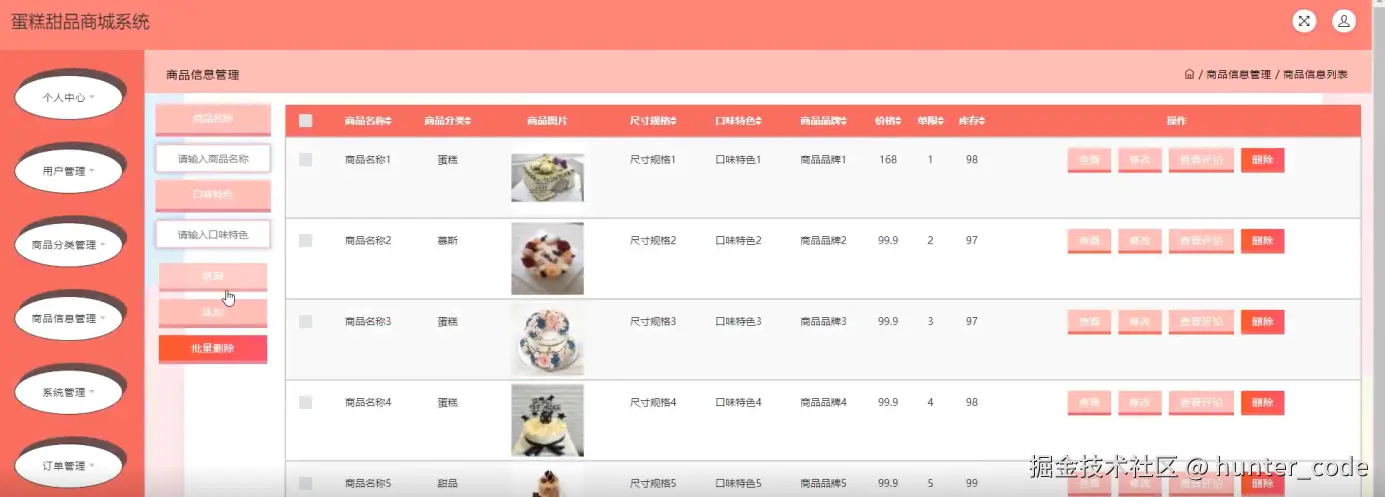 商品信息管理;在商品信息管理页面中可以对商品名称、商品分类、商品图片、尺寸规格、口味特色、商品品牌、价格、单限、库存等内容进行查看,修改,查看评论和删除等操作;如图4-10所示。