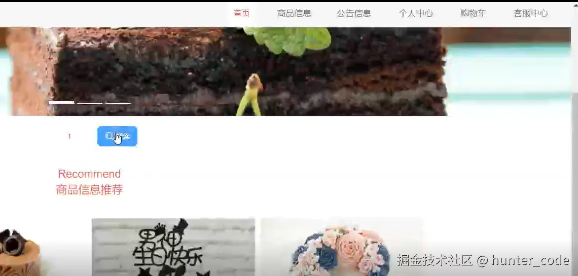 蛋糕甜品商城系统,用户进入到系统首页,可以查看首页、商品信息,公告信息,个人中心、购物车,客服中心等内容进行操作,如图4-1所示。