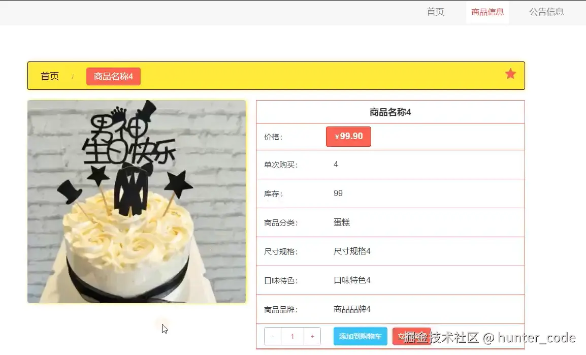 商品信息;在商品信息页面中可以查看价格,单次购买,库存,商品分类,尺寸规格,口味特色,商品品牌等内容,并进行添加到购物车或立即购买等操作;如图4-2所示。