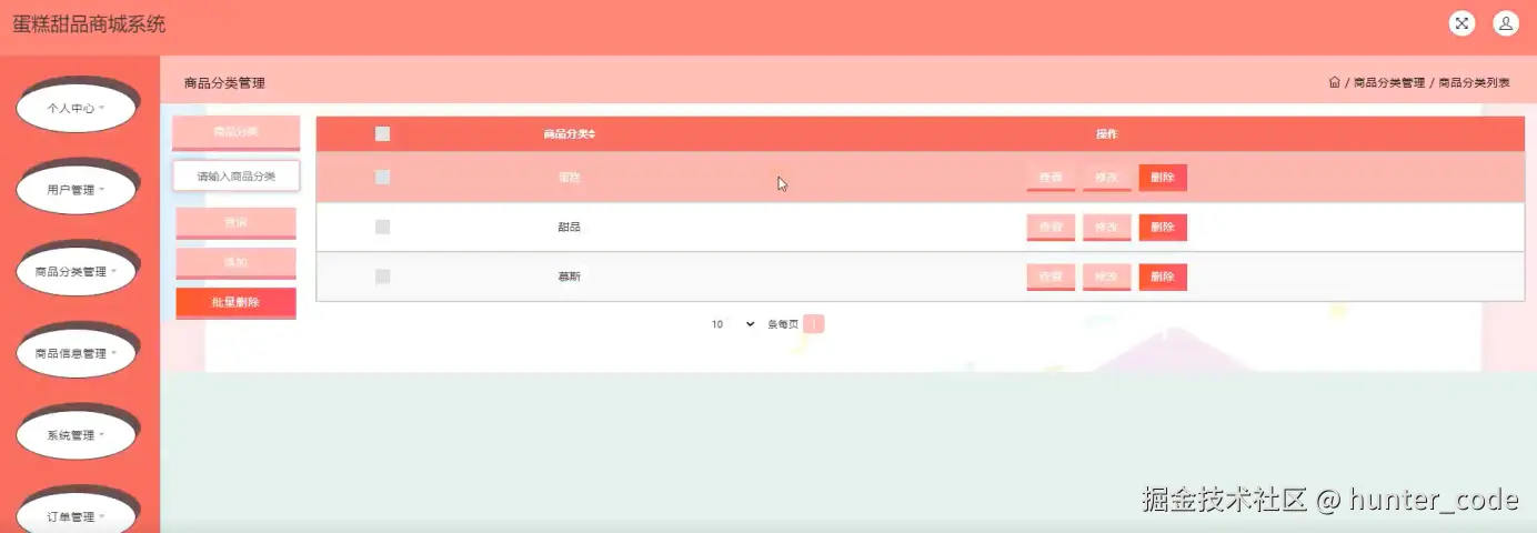 商品分类管理;在商品分类管理页面中可以对商品分类信息进行查看,修改和删除等操作;如图4-9所示。