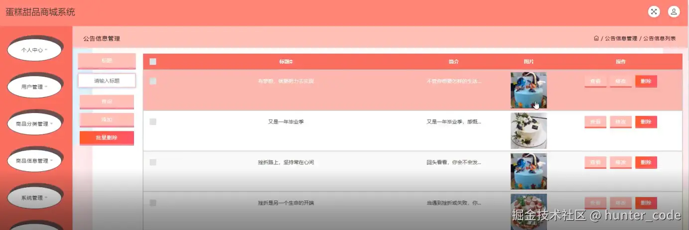 系统管理;在公告信息页面中可以对标题、简介、图片等内容进行查看,修改和删除等操作;还可以对咨询中心,轮播图管理进行详细操作;如图4-11所示。