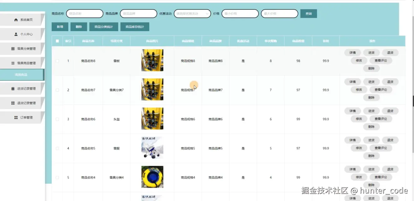 管理员点击雪具商品管理。在雪具商品页面输入商品名称、商品品牌、价格和选择优惠活动进行查询、商品分类统计、商品库存统计、新增或删除雪具商品列表,并根据需要对雪具商品详情信息进行详情、查看评论、修改或删除操作;如图5-10所示: