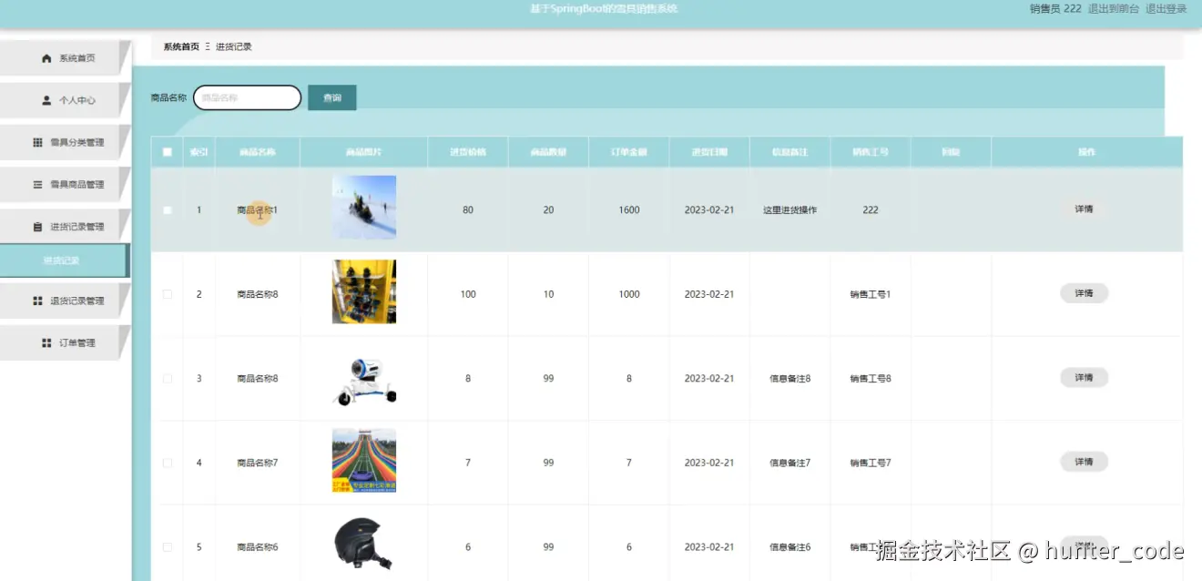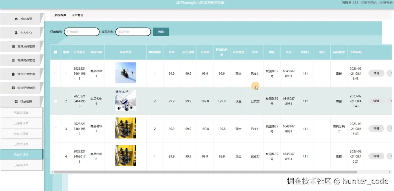 对雪具销售管理的流程进行科学整理、归纳和功能的精简,通过软件工程的研究方法,结合当下流行的互联网技术,最终设计并实现了一个简单、易操作的雪具销售系统。内容包括系统的设计思路、系统模块和实现方法。系统使用过程主要涉及到管理员、用户和销售员三种角色,主要包含个人中心、销售员管理、用户管理、雪具分类管理、雪具商品管理、进货记录管理、退货记录管理、系统管理、订单管理等功能。