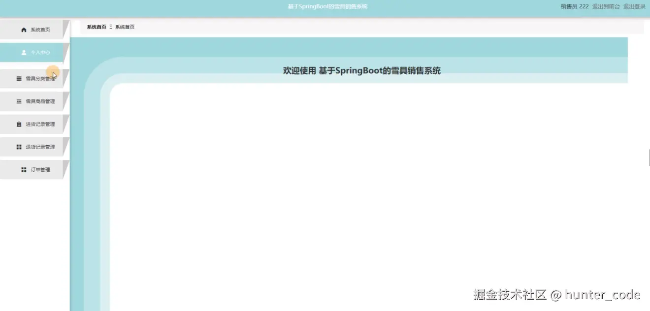 销售员进入系统可以对个人中心、雪具分类管理、雪具商品管理、进货记录管理、退货订单管理、订单管理等功能进行操作。销售员主页面如图5-14所示: