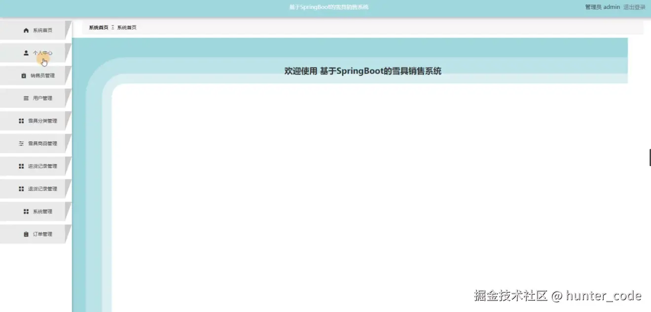 管理员进入主页面,主要功能包括对个人中心、销售员管理、用户管理、雪具分类管理、雪具商品管理、进货记录管理、退货记录管理、系统管理、订单管理等进行操作。管理员主页面如图5-7所示: