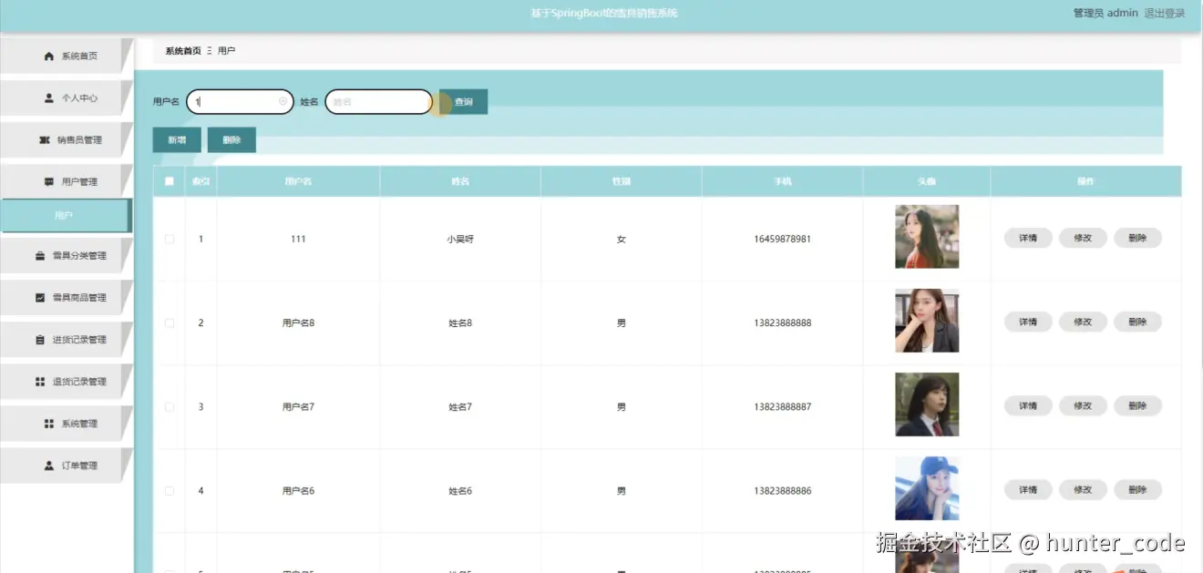 管理员点击用户管理。在用户页面输入用户名、姓名进行查询、新增或删除用户列表,并根据需要对用户详情信息进行详情、修改或删除操作;如图5-9所示: